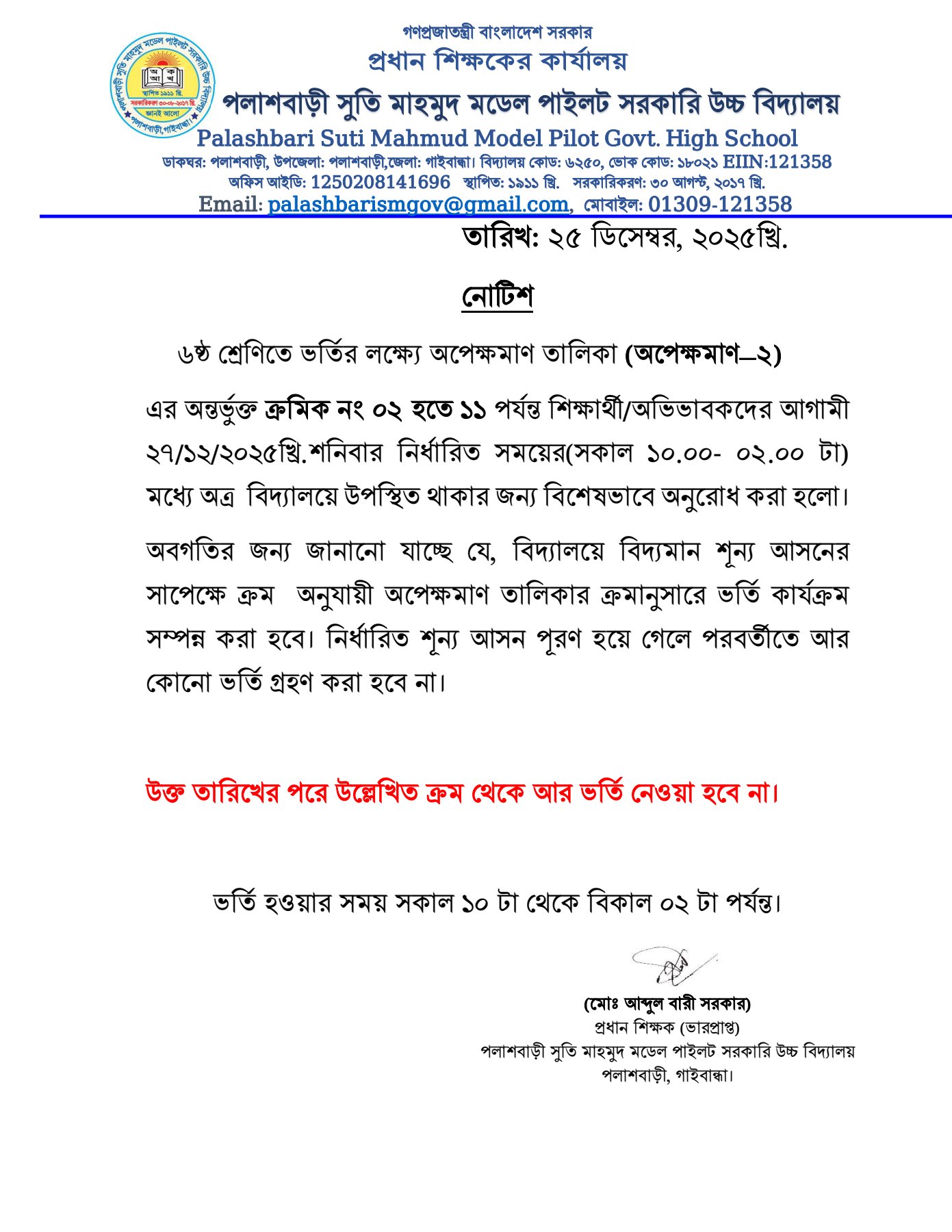 Admission-2026, waiting List. 2